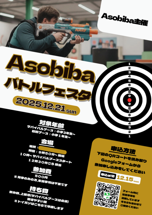 それと小学校でお手紙は配布していますが、21日には、NARFのトイガンを使って小学校の体育館で遊ぶ『Asobibaバトルフェスタ』を開催します!!!